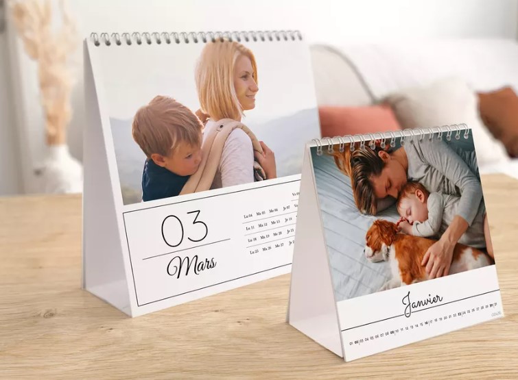 Pour une table de travail, le calendrier chevalet ou sur support bois est parfait. Afin de planifier vos rendez-vous, vous pouvez aussi personnaliser un agenda de format A5 avec vos photos préférées. Le plaisir du papier reste incomparable.